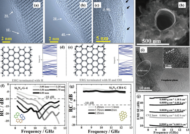 4陶瓷與ERG(f)和傳統(tǒng)CVD石墨烯(g)的RL曲線。在碳納米管上生長ERG的SEM(h)和TEM(i)。j)CNT泡沫和ERG裝飾的CNT泡沫的電磁屏蔽效率。