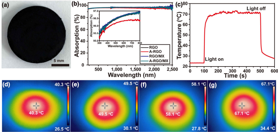 Figure 3. (a)A-RGO/MX水凝膠的數碼照片。(b)在220–2,500 nm波長范圍內的吸收光譜(插圖顯示在220–800 nm波長范圍內的吸收光譜)。(c)A-RGO/MX氣凝膠響應光照下溫度曲線的時間軌跡。(d)1、(e)3、(f)5和(g)7光照強度下,A-RGO/MX水凝膠的表面溫度。