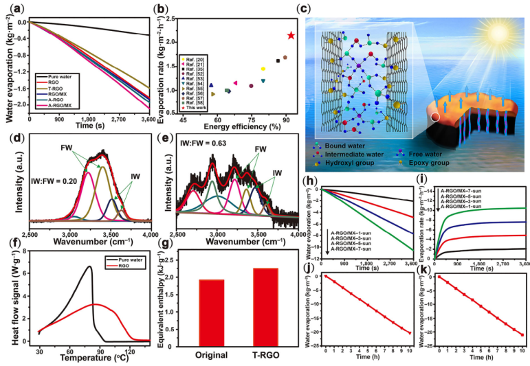 x MXene(A-RGO/MX)雜化水凝膠與排列的通道作為獨立的太陽能蒸汽產生裝置,以高效地產生太陽能蒸汽。由液氮輔助定向凍結過程生成的垂直排列的通道不僅將水迅速向上傳輸到蒸發表面,以有效地產生太陽能蒸汽,而且還促進通道內太陽光的多次反射,從而有效吸收太陽光。略微減少使RGO具有大量極性基團,有效降低了水汽化焓,從而有效地加速了水汽化。基于Marangoni效應滲透到A-RGO水凝膠內部的MXene片增強了光吸收能力和光熱轉換性能。結果,A-RGO/MX雜化水凝膠在1次太陽照射下實現了2.09 kg·m