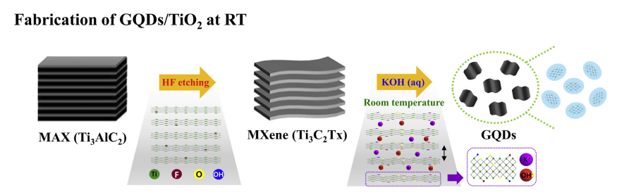 碳化物衍生的石墨烯量子點(GQDs)具有無毒、強大的集光能力和較大的表面積,因此在光致發光領域具有很高的潛力。為了經濟有效且穩定地生產GQDs,降低GQDs的合成溫度是一個很好的選擇,但仍然是一個很大的挑戰。在此,通過在室溫下控制MXene的KOH(水溶液)的反應時間和濃度,獲得光致發光GQDs。這種簡便且經濟高效的方法可以生產GQDs/TiO