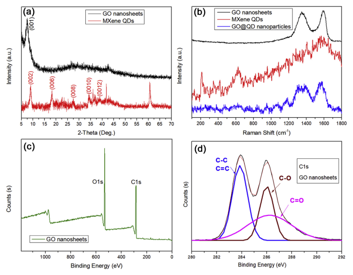 Figure 2. (a)GO和QD的XRD;(b)GO、QD和雜化粒子的拉曼光譜;(c)GO的XPS全譜和(d)GO的XPS C1s光譜。
