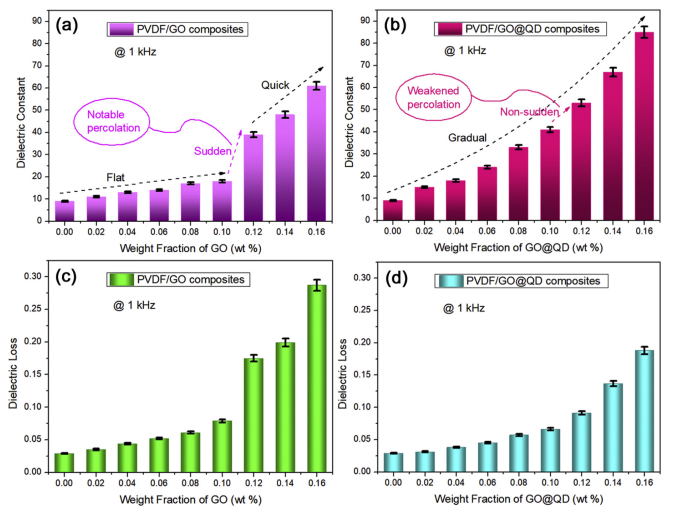 Figure 4. 在1 kHz時,(a)二元復合材料的介電常數,(b)三元復合材料的介電常數,(c)二元復合材料的介電損耗和(d)三元復合材料的介電損耗。