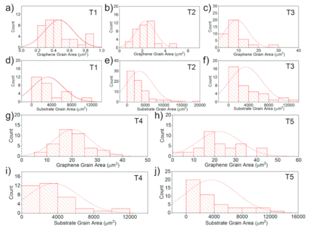 Figure 2. (a-c,g-h)石墨烯晶粒面積分布,和(d-f,i-j)(T1-T5)相應襯底晶粒面積的分布。