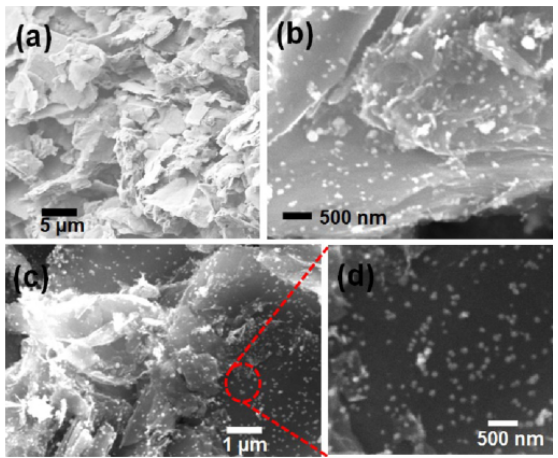 Figure 2. (a)GO納米片的不同放大倍數(shù)SEM圖像,(b)GO表面上的Rh納米球(Rh−GO)(Rh NSs,?50 nm),(c-d)GO納米片和Rh NSs均勻分散在GO表面上。