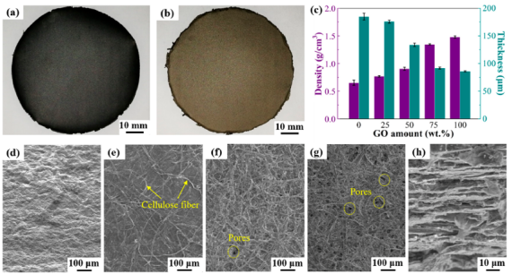 Figure 2. GO-纖維素膜的形貌:(a)75 wt%的GO膜和(b)25 wt%的GO膜的光學(xué)圖像;(c)GO-纖維素膜在不同GO含量時(shí)的密度和厚度;(d-g)100、75、50,和25wt%的GO膜的SEM圖;(h)25 wt%GO膜的橫截面SEM圖像。
