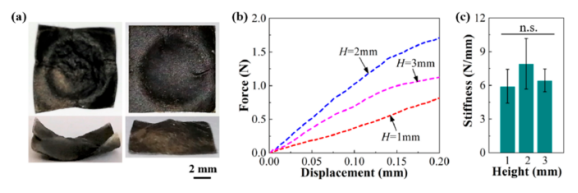 Figure 4. GO-纖維素半球形帽的硼砂交聯(lián):(a)硼砂交聯(lián)的75 wt%GO帽的光學(xué)圖像(左側(cè):壓印后交聯(lián)狀態(tài);右側(cè):壓印過程時(shí)的交聯(lián)狀態(tài));(b)硼砂交聯(lián)的75 wt%GO帽的力-位移曲線;(c)交聯(lián)后75 wt%GO帽的剛度。