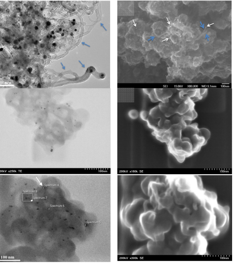 Figure 1. (a,b)特殊純化之前的GrPt復合材料的TEM和SEM圖像;經過特殊純化的納米復合材料的(c,e)TEM和(d,f)SEM圖像