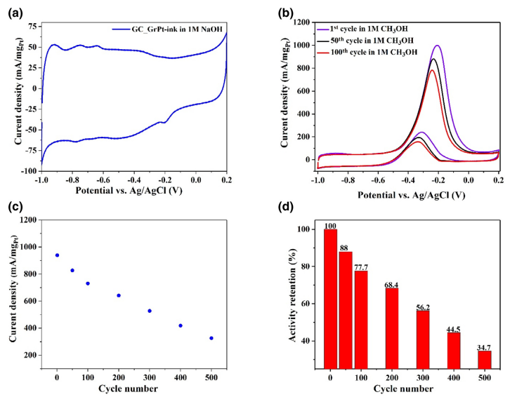3OH/1 M NaOH溶液中。(d)在1 M堿性甲醇溶液中經過500次循環后,評估GC_GrPt-ink電極的活性保留率(%)。