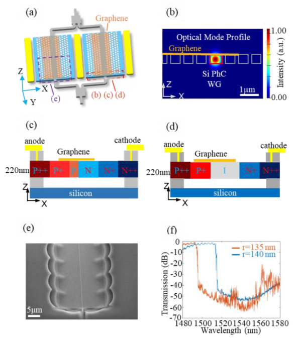 Figure 2. 設備原理圖。(a)提出的G-Si光子晶體波導(PhC WG)MZM調制器的示意圖。(b)PhC WG在1550 nm處的橫截面光學模式輪廓(TE模式)。(c)石墨烯硅p-n結調制器的摻雜曲線。(d)石墨烯硅p-i-n結調制器的摻雜曲線。(e)鑄造加工的硅PhC WG的SEM圖像。(f)底切后測得PhC WG的透射光譜。r:PhC平板中孔的半徑