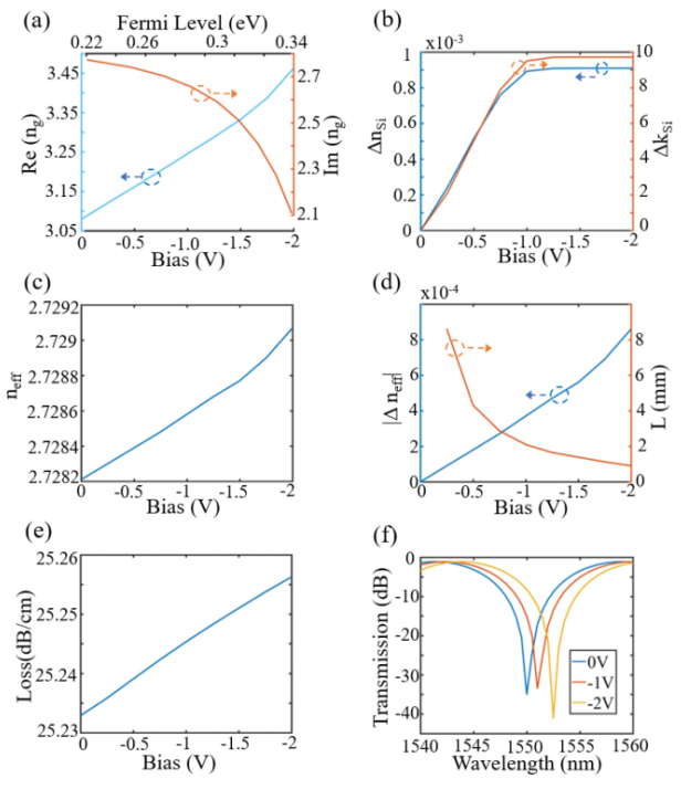 Figure 3. G-Si p-n結調制器。(a)G費米能級和折射率在0至-2V的反向偏壓下變化。(b)硅折射率的實部和虛部在0至-2V的反向偏壓下變化。(c)在0至-2V的反向偏壓下,混合結構的有效折射率變化。(d)總有效折射率變化和在0至-2V的儲備偏置下實現π相移的長度。(e)保留偏置從0到-2V的混合波導的損耗。(f)在0至-2V偏壓下驅動1550 nm附近的MZM的一個臂的透射光譜