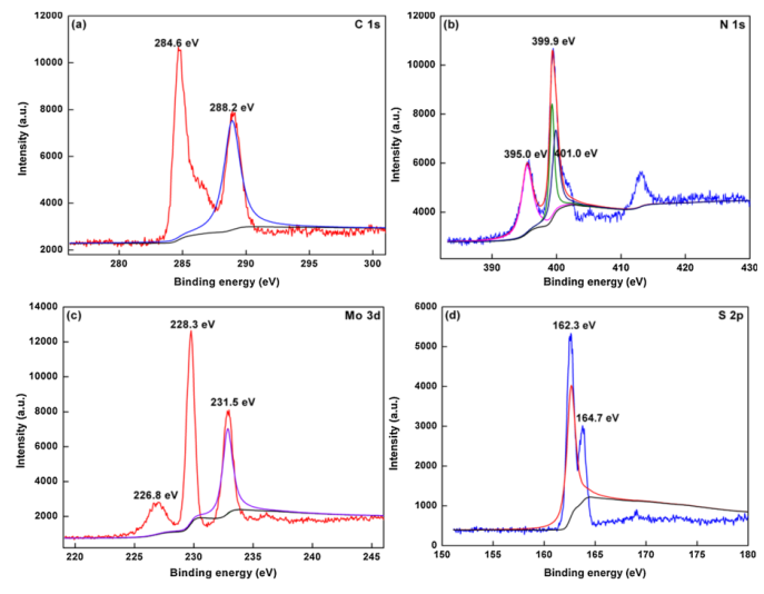 2/3DG的XPS 圖譜: (a) C 1s, (b) N 1s, (c) Mo 3d, (d) S 2p