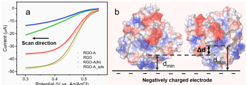 2的線性掃描伏安圖。(b)在帶負電荷的電極表面上,BOD的兩種邊界取向導致界面電子從電極到BOD的T1銅位點的隧穿距離不同的示意圖。