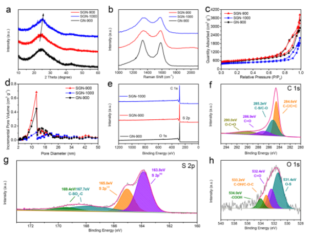 Figure 3. SGN-900,SGN-1000和GN-900的結構,組分和近表面化學特征。包括(a)XRD,(b)拉曼光譜,(c)氮吸附-解吸等溫線曲線和(d)相應的孔徑分布。 (e-h)XPS光譜。
