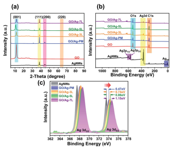 Figure 3. 所有樣品的XRD圖譜(a)。所有樣品的XPS光譜(b)。Ag 3d譜帶的XPS光譜(c)。