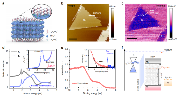Fig. 1 相對于石墨烯(G)和金(Au)的Ruddlesden-Popper鈣鈦礦(RPP)的費米能級和能帶邊緣的光譜分析。