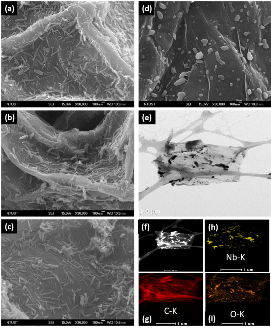 2/NbC/rGO的(e)TEM圖像和(f)HAADF-STEM圖像,以及(g)碳、(h)鈮和(i)氧元素的相應EDX元素映射結果。