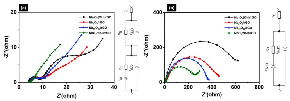 Figure 3. 極化電位為(a)1 V和(b)0.25V各種樣品的奈奎斯特圖