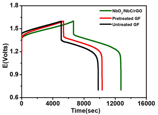 -2充放電電流密度下顯示出89.3%、81.7%、71.0%和59.3%的電壓效率,這些性能優于使用預處理的GF和未處理GF的性能。使用NbO