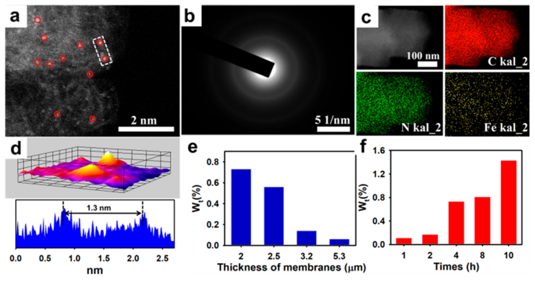Figure 3. (a)HAADF-STEM圖像。(b)相應的SAED。(c)C、N和Fe的EDS映射。(d)相對于a部分Fe SAs的相應表面輪廓和距離輪廓。(e,f)在各種條件下SACs的鐵含量(e,合成具有不同厚度的GOM以制備SACs;f,合成厚度為2μm的GOM以制備在不同擴散時間的SACs)