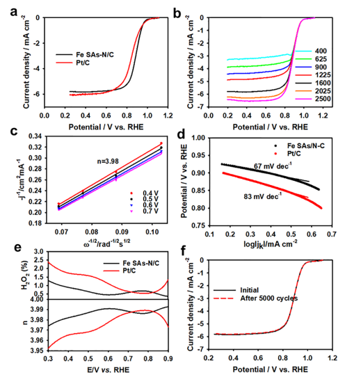 2產率與電勢的關系。(f)Fe SAs/N-C在5000次循環之前和之后的RDE極化曲線(0.6至1.0 V(vs RHE))。