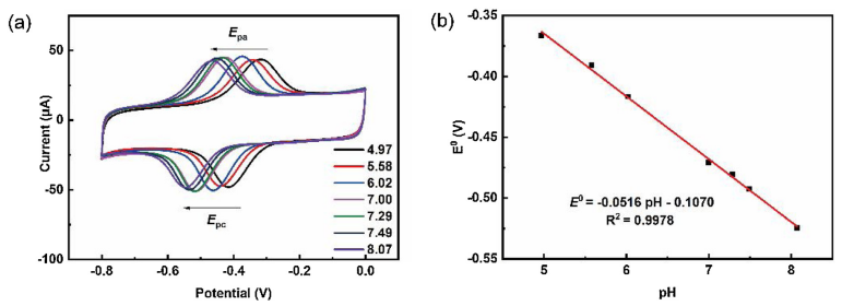Figure 4. 在具有不同pH值的PBS溶液中,石墨烯薄片電極的(a)CV曲線,以及(b)E