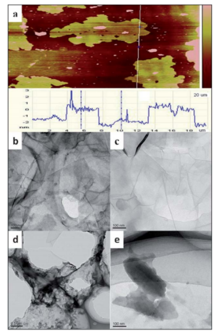 Fig. 5 (a) GA-II/石墨烯的AFM圖像、(b)溶液懸浮液沉積在基底上的原始石墨烯,(c) GA-II/石墨烯的TEM圖,(d,e)分散在環氧基體中的GA-II/石墨烯的TEM圖。