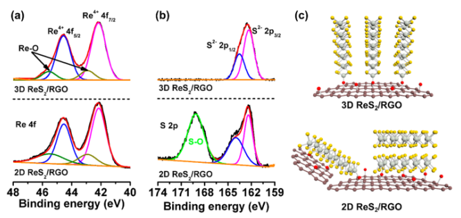 Figure 2. 3D ReS2/RGO異質(zhì)納米片和2D ReS2/RGO異質(zhì)納米片的(a)Re 4f和(b)S 2p的XPS光譜。(c)3D ReS2/RGO異質(zhì)納米片和2D ReS2/RGO異質(zhì)納米片的結(jié)構(gòu)示意圖。
