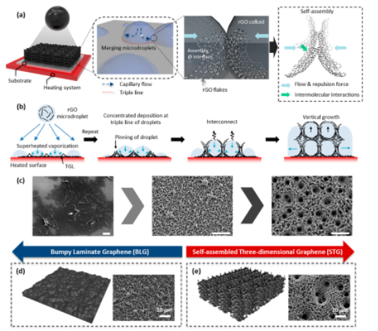目前,研究人員正在高度關(guān)注有效3D石墨烯的發(fā)展,適用于儲(chǔ)能和環(huán)境純化領(lǐng)域。但是,在商業(yè)化之前,有必要開(kāi)發(fā)一種方法可以大規(guī)模生產(chǎn)此類材料并實(shí)現(xiàn)良好的控制其結(jié)構(gòu)和化學(xué)性質(zhì)。為了這個(gè)目標(biāo),這里,在過(guò)熱液體-蒸汽界面處通過(guò)自組裝石墨烯片,可以生產(chǎn)大尺度(4英寸晶圓)3D石墨烯網(wǎng)絡(luò)。通過(guò)控制汽化速率,基材的表面溫度和排出膠體數(shù)量,可以調(diào)控多孔網(wǎng)絡(luò)的結(jié)構(gòu)形態(tài)。此外,通過(guò)對(duì)微滴行為的高速可視化和廣泛的熱分析,揭示了其背后的關(guān)鍵機(jī)制。這種自組裝的3D石墨烯具有出色的電氣和機(jī)械性能,該方法可以直接用于石墨烯基材料的批量生產(chǎn)。