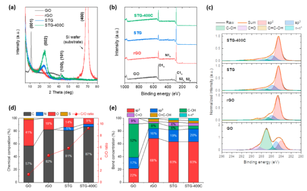 Figure 4. STG的化學(xué)表征。(a)XRD光譜。(b)XPS光譜。(c)高分辨率C 1s XPS光譜。(d)XPS總譜獲得的化學(xué)成分。(e)由C 1s XPS光譜計(jì)算得出的鍵濃度。
