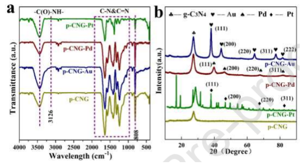 Figure 1. (a)3D p-CNG骨架和3D p-CNG-M(Au,Pd,Pt)復合催化劑的FTIR光譜和(b)XRD圖。