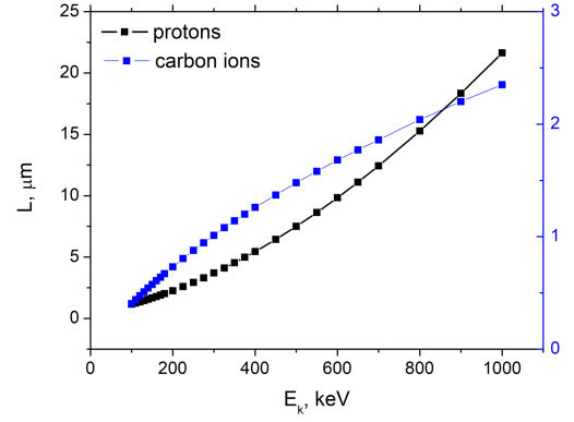Figure 3. 通過SRIM軟件包計算的PMMA中質子(黑色方塊)和碳離子(藍色方塊)范圍的相關性。