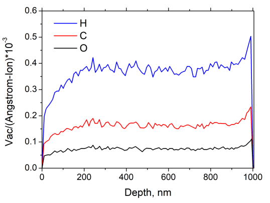 Figure 4. 對地靜止軌道(GEO)(SRIM數值模擬)上,1 µm厚石墨烯/PMMA雙層質子譜的空位分布