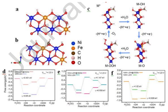 Figure 1. (a) NiFe LDH和 (b) NiFe LDH/GQDs的計(jì)算模擬。(c) NiFe LDH/GQDs催化路徑。(d-f)計(jì)算得到不同電位下Ni基LDH@GQDs和Ni基LDH模型在Ni金屬位點(diǎn)上的OER自由能圖。