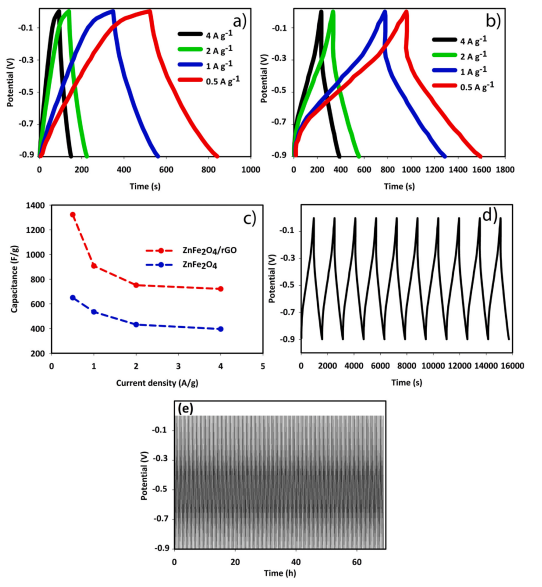 4-rGO的比電容估計為1419 F/g,在10 mV/s的掃描速率下,連續5000次伏安循環后,其循環穩定性為93%。電化學測試證實,由于rGO的表面積大、導電率高,因此添加rGO不僅改善了電極的電導率,還改善了放電時間和循環穩定性。ZnFe