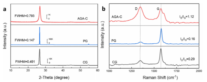 Fig. 2. CG、PG、AGA-C的相結構分析。(a)樣品的XRD譜圖。(002)峰的半峰寬(FWHM)被標記出來,刻度條顯示峰的強度。(b)樣品的拉曼光譜,標記d波段與g波段的強度比。