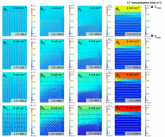 Fig. 4. (a-d)模擬了1、2、4、6 mA cm-2不同電流密度下(a-c) AGA-C和(d) CG電極中的鋰離子濃度。對不同排列角度的AGA-C電極進行了研究,分別為(a) 90°、(b) 45°和(c) 10°。