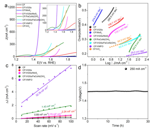 Figure 5. 不同樣品在1 M KOH中測試的OER性能。a LSV曲線。b Tafel圖。c不同掃描速率下的電容電流。d CF/VMFO在250和500 mA cm-2時(shí)隨時(shí)間變化的過電勢曲線。