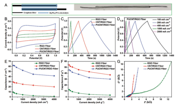 Figure 4. RGO,CNT/RGO和PUCNT/RGO纖維基SC的電化學性能。A)纖維狀SC的示意圖和照片。B,C)在10 mV s–1掃描速率下的CV曲線和在100 mA cm–3的電流密度下的GCD曲線。D)PUCNT/RGO纖維在各種電流密度下的GCD曲線。E,F)不同電流密度下的體積和質量電容。G)電化學阻抗譜。
