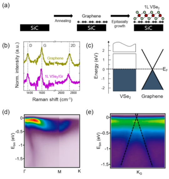 Figure 1. 1L VSe2/Gr異質結構的樣品制備以及結構和電子性質。(a)SiC上構建1L VSe2/Gr異質結構。(b)在沒有和有1L VSe2時的拉曼光譜。(c)1L VSe2/Gr異質結構中的能帶排列示意圖。(d)1L VSe2/Gr的ARPES光譜(e)在Gr(KG)的K點附近的1L VSe2/Gr的ARPES光譜,強調了Gr的線性Dirac能帶結構。