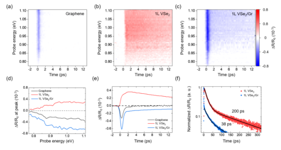 Figure 2. 在不同探針能量下的瞬態反射率(TR)測量。(a)Gr,(b)1L VSe2和(c)1L VSe2/Gr中的TR二維圖。(d)選定的TR光譜。(e,f)不同時延范圍內TR測量的時間分辨軌跡。