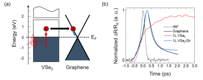 Figure 3. 1L VSe2/Gr界面處的層間熱電子轉移。(a)從VSe2到Gr的層間熱電子轉移的示意圖。(b)Gr,1L VSe2和1L VSe2/Gr的時間分辨的TR結果。
