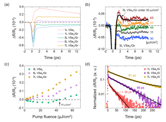 Figure 4.(a)3L,5L和7L VSe2/Gr的時間分辨TR測量。(b)3L VSe2/Gr在各種泵注量下的TR信號。(c)從每個樣品獲得的泵浦流量相關的TR信號。(d)MtL VSe2/Gr中的衰減特性。