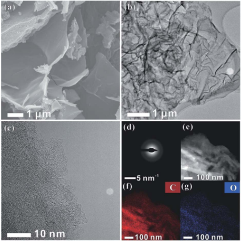 Figure 1. SMG的形態表征:(a)SEM圖像;(b)透射電鏡圖像;(c)HRTEM圖像;(d)SEAD模式;和(e–g)EDS圖片,以及C和O的對應元素圖。