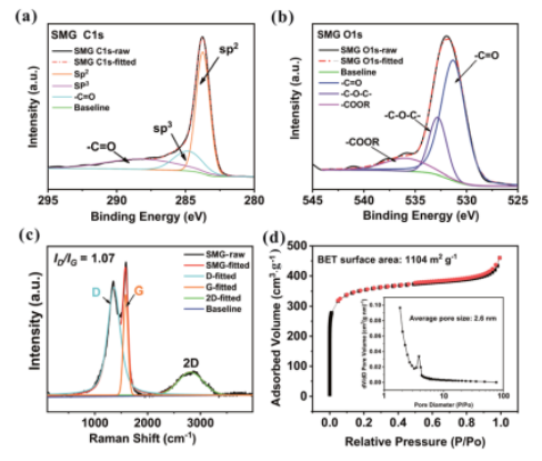 Figure 3. SMG的(a)C 1s和(b)O 1s的反卷積XPS光譜;(c)具有相應ID/IG比的拉曼光譜;和(d)N2吸附/解吸等溫線。
