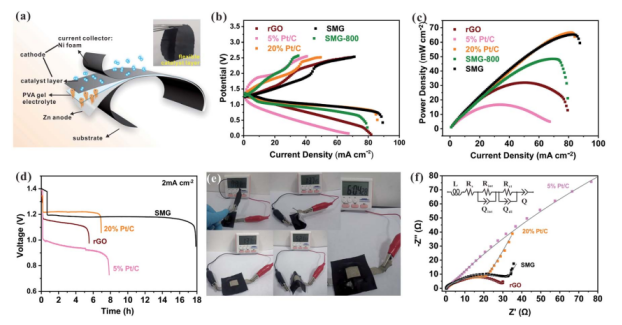 Figure 4. 固態ZAB中SMG,SMG-800,rGO,5%Pt/C和20%Pt/C的電化學特性。(a)鋅空氣電池;(b)充電/放電極化曲線,(c)相應的放電功率密度;(d)2 mA cm-2電流密度下的放電曲線;(e)鋅-空氣柔性電池的示范圖;(f)奈奎斯特圖和擬合曲線。