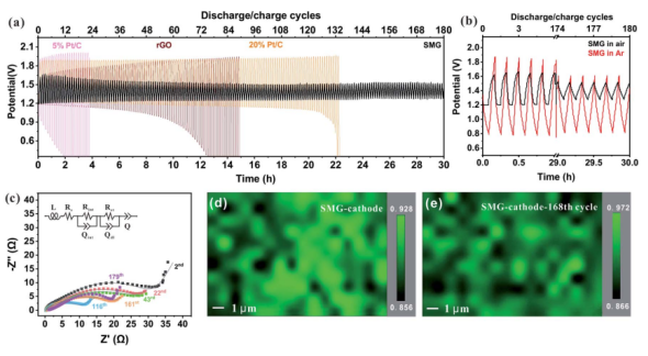 Figure 5.(a-b)不同電極在2 mA cm-2電流密度下的充電/放電曲線,(c)在不同脈沖周期時的奈奎斯特曲線圖和擬合圖;基于ID/IG堆棧的共焦拉曼成像,在脈沖周期之前(d)和之后(e)覆蓋20 X 30 mm2的SMG陰極。