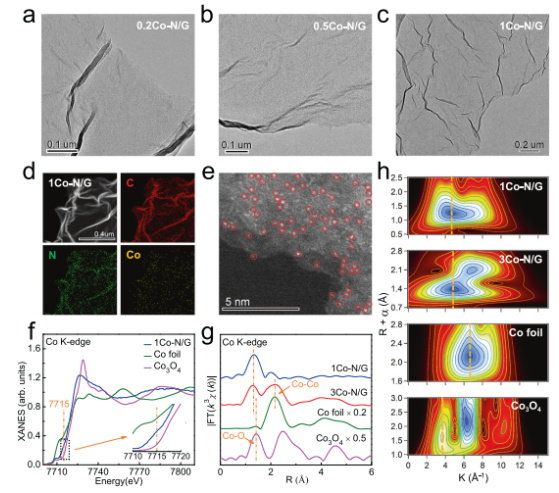 Figure 1. Co原子的原子分散。a-c)樣品的TEM圖像。D)EDX元素映射和HAADF-STEM圖像;f)Co K邊緣XANES光譜。g FT k3加權Co K-edge EXAFS光譜和EXAFS光譜的h WT分析。