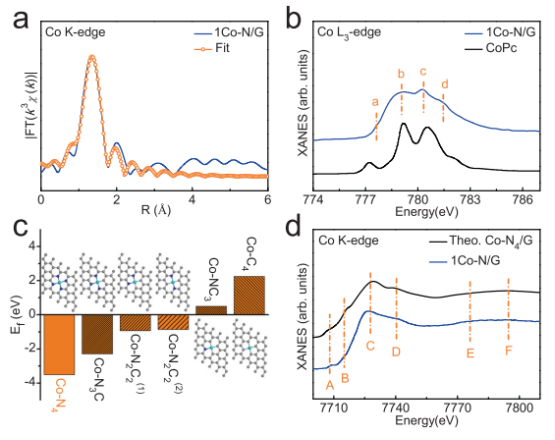 Figure 2. Co原子周圍的配位構型。a)在R空間中的Co K邊緣EXAFS擬合曲線。b)Co L3-edge XANES光譜。c)DFT計算了石墨烯晶格中各種Co-N4-xCx部分的形成能。d)實驗性Co-edge XANES光譜比較。