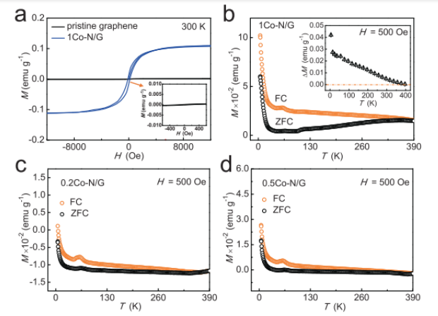 Figure 3. 磁性能。a)扣除背景后,原始石墨烯和1Co-N/G納米片的磁化強度與磁場(MH)曲線。b)1Co-N / G納米片的FC和ZFC磁化強度(MT)的溫度依賴性。c,d )FC和ZFC磁化強度(M–T)曲線的溫度依賴性。