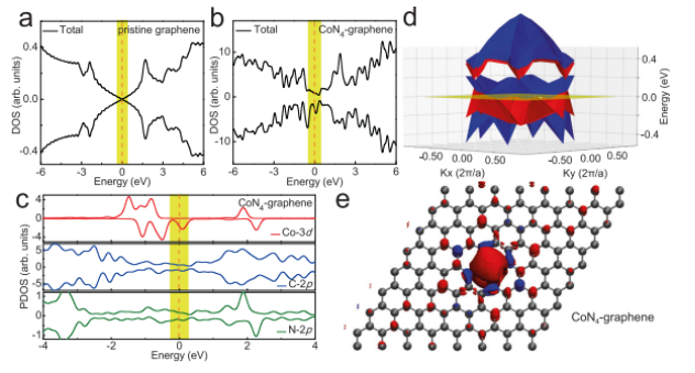 Figure 4. 鐵磁性的電子結構和起源。a)DFT計算了原始石墨烯和b CoN4-石墨烯體系的TDOS。c)DFT計算的CoN4-石墨烯系統的PDOS。 d)CoN4-石墨烯能帶結構的二維圖。e)自旋密度的空間分布(ρ↑-ρ↓)。